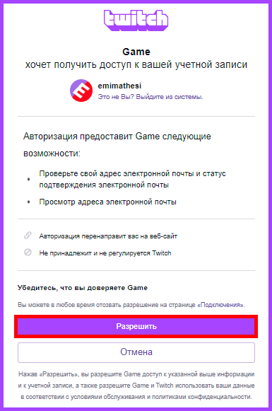 Если перед привязкой у Вас выполнен вход в какой-либо другой Twitch-аккаунт — нужно выйти из него на странице: https://www.twitch.tv/